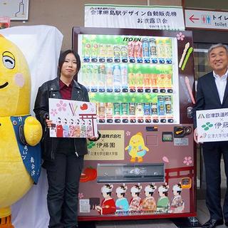 応募作品の中から選ばれた学生デザインの自動販売機は、順次各所に設置されていますが、このたび南会津町・会津田島駅の改札口前に設置されました。2025年10月8日、会津鉄道株式会社代表取締役社長・佐藤喜市様等へ完成報告を行うとともに、除幕・お披露目会を開催しました。